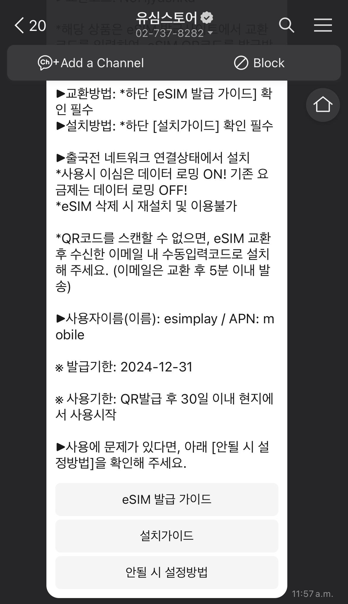 저는 설치 가이드 누르면 나오는 정보대로 바로 한국에서 설정 완료하였고, 현지 공항 도착하자마자 데이터 로밍